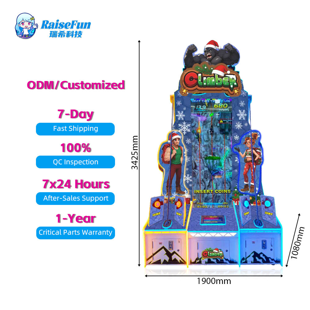 This is a fun double-player competitive ticket redemption machine centered around the "rock climbing challenge" gameplay: Players control characters to climb by operating the device, avoid obstacles, compete for scores, and finally win ticket rewards. The machine features a vibrant design with Christmas-themed decorations (gorilla figure + snowflake elements), which is highly eye-catching and ideal for placement in arcades, amusement parks, and similar venues.