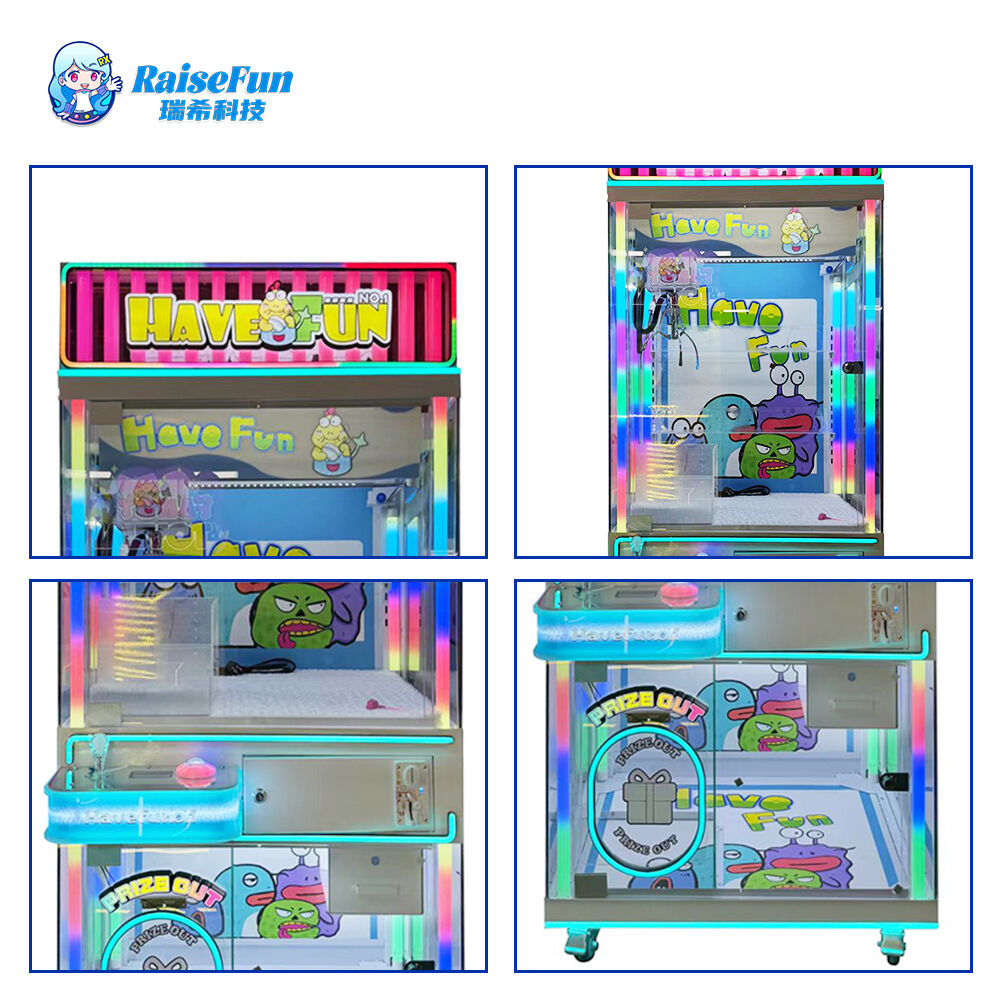 This single-player claw machine fits entertainment venues like malls and arcades. It features a cartoon-themed design (fun monster patterns) with colorful ambient lights, plus a fully transparent compartment for eye-catching prize display. With precise joystick control and adjustable claw strength (relaxing solo play), it supports coin/scan payment and has built-in counting—making it a visually appealing, interactive device to boost venue traffic.