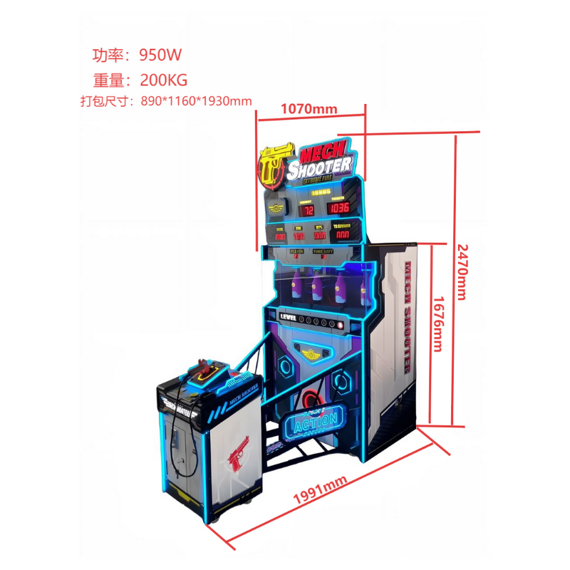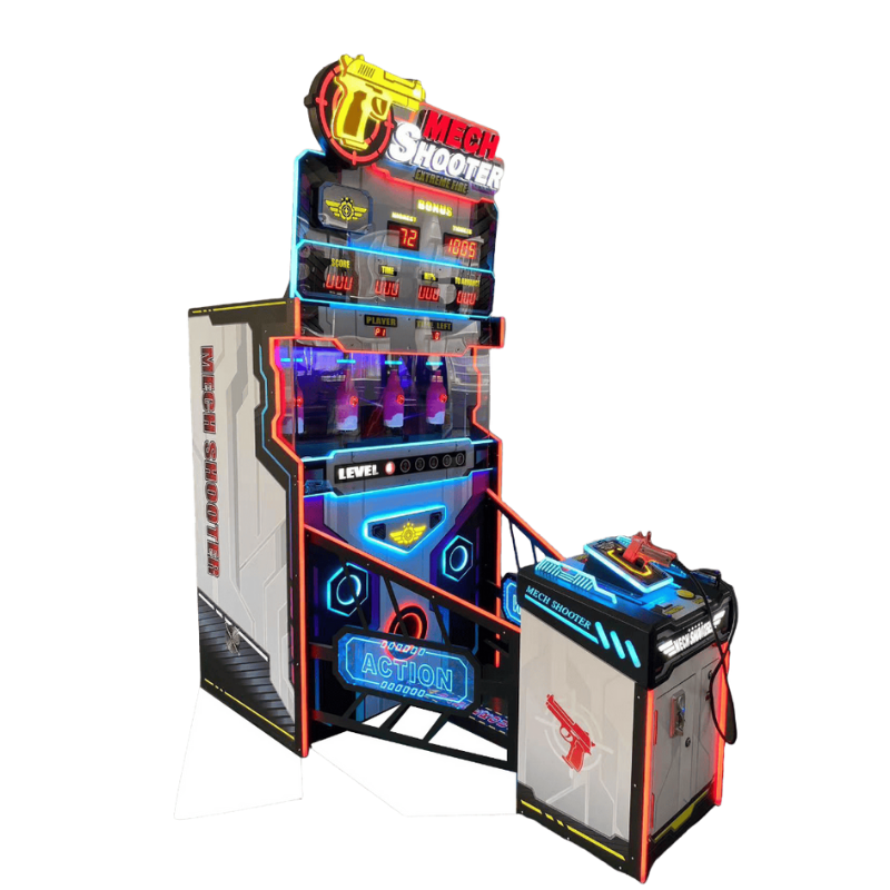 Mech Shooter digital shooting game features metal screen tech for solo/multiplayer modes. Six progressive levels with moving targets from Stage 4. Auto-ticket rewards based on scores deliver immersive mech-themed entertainment for arcades.