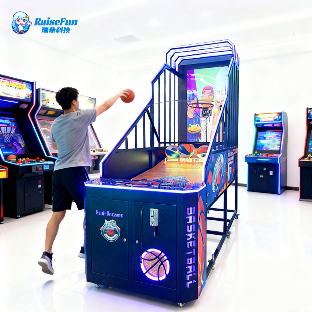 Tilted platform and cartoon screen for real shooting feel; coin-activated, real-time scoring when making baskets; colorful LED lights attract crowds.