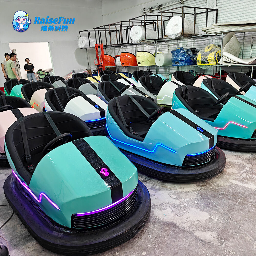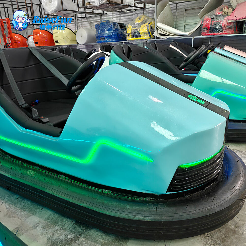 2-seater bumper car (battery/ground grid versions), 140kg max load, inflatable anti-collision chassis, 6-10km/h speed, ambient lights—ideal for amusement parks.